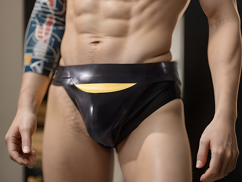 This thong is crafted from a durable 0.35mm thick, high-gloss black latex. The material's smooth, reflective surface creates a vibrant "wet-look" sheen that intensifies under the light. This luminous quality gives the garment a sleek, liquid appearance, while the yellow arc accent provides a dynamic color contrast, enhancing the overall design.