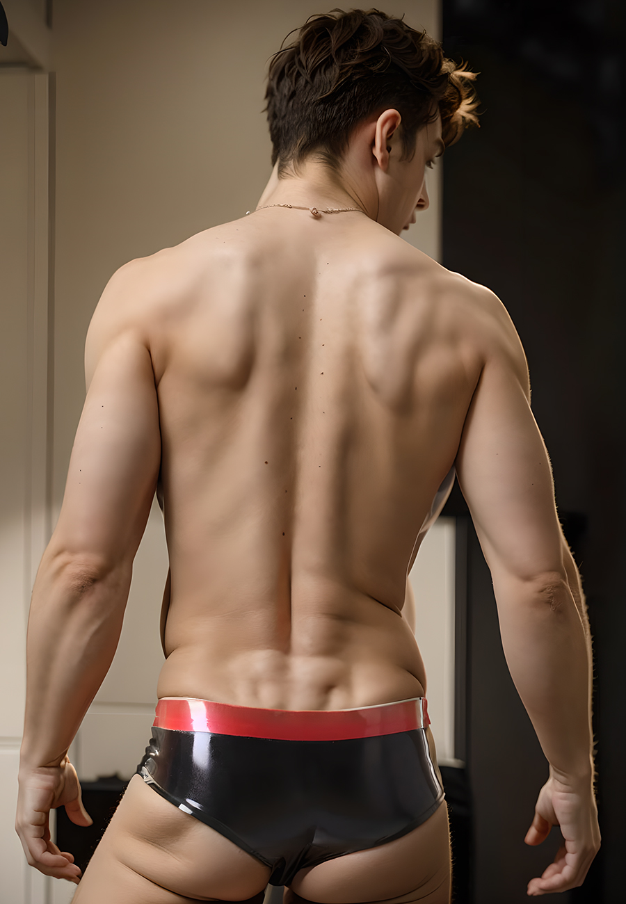These shorts are crafted from a durable 0.35mm thick, high-gloss black and red latex. The material's smooth, reflective surface creates a vibrant "wet-look" sheen that intensifies under the light. This luminous quality gives the garment a sleek, liquid appearance. The vibrant red waistband provides a dynamic and energetic color contrast, enhancing the overall design.