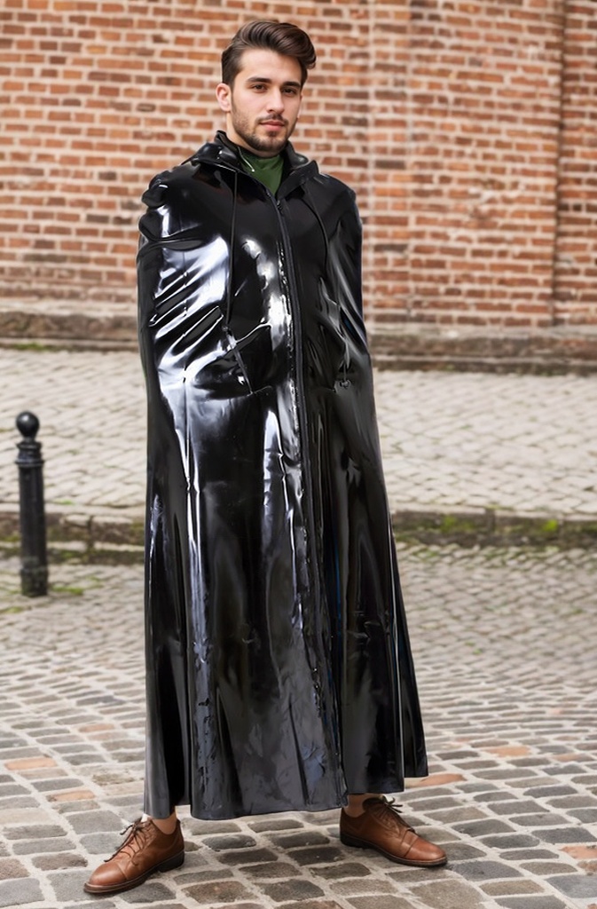 This cloak is made from 0.80mm thick, high-gloss black latex. The material's surface is smooth and has an intense, mirror-like sheen that brilliantly reflects light, giving the black cloak a rich, textural feel. The latex also has a nice drape, allowing the hem to fall in natural, flowing lines.