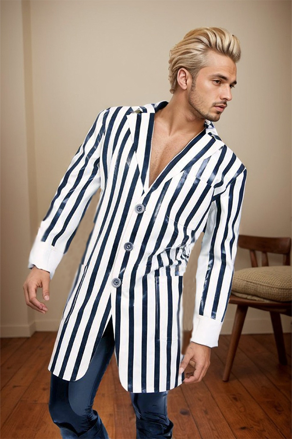 This Men's Striped Half-Jacket is a unique and stylish piece that redefines latex outerwear. Its loose, yet tailored silhouette and striking vertical stripes create a bold, modern look that stands out from the crowd.