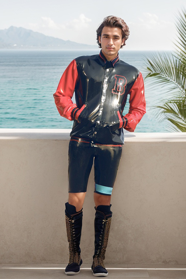 This 'College Varsity' jacket is expertly crafted from a smooth, high-sheen 0.60 mm natural latex. Its design is a masterful blend of a casual, sporty silhouette with modern, high-contrast details, making it a truly unique piece that projects confidence and style.